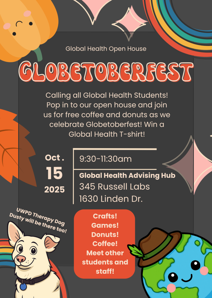 Calling all Global Health Students! Pop in and join us for free coffee and donuts as we celebrate Globetoberfest! Take a break between classes to come say hello, pet Dusty the UWPD Therapy Dog, enjoy a crafting and games with fellow students, and enter to win a Global Health T-shirt. We’re excited to see you and celebrate the arrival of Fall!